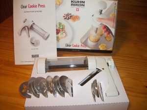 I must admit, this was the first time I ever used a cookie press. I was send a Kuhn Rikon cookie press, and I really liked it. It was easy to fill with the cookie dough, the kids did all the pressing and had a ball., easy one handed I may add. Once we had all our cookies on the cookie sheet, clean up was a breeze. The cookie press was easy to take apart and every piece was easily cleaned. However the manufacture recommends not to put it in the dishwasher, it may discolor, but it is so simple to just hand wash it real quick.