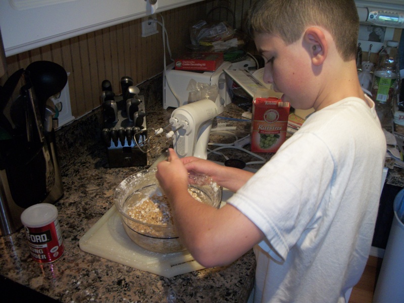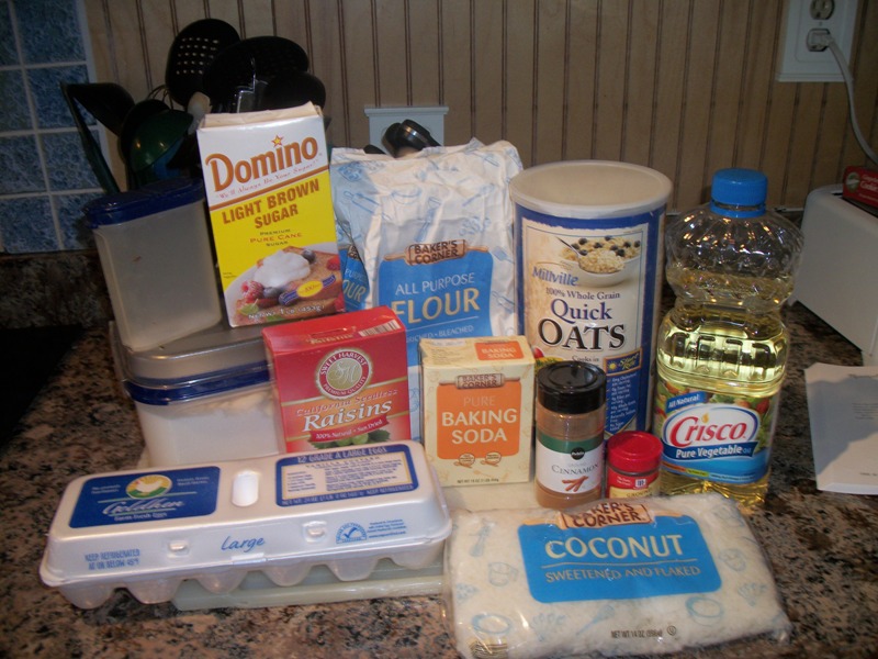 - Children can help measure sugar, oil, and eggs into a large bowl; stir with a wooden spoon until smooth. Add oatmeal, flour, baking soda, salt, cinnamon, cloves, raisins and coconut. mix well.
