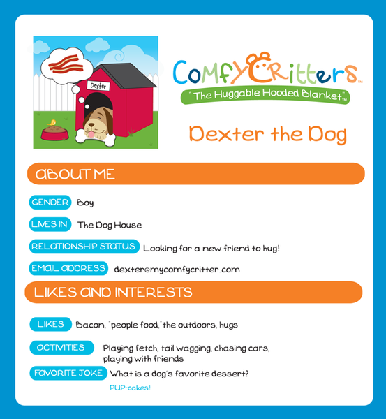 Dexter the Dog is the most loveable, huggable, snuggable puppy around an he’s looking for new friends! Dexter is made from super soft, high quality chenille fleece. He starts out as a huggable stuffed animal. Release his Velcro strap and he is a wearable, snuggable hooded blanket! Blanket dimensions: 47” W x 36” H.