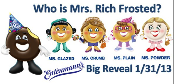 Rich and Entenmann’s Bakery have decided to get the fans in on the excitement and will be running a Facebook survey for YOU to vote on who you believe is “Mrs. Rich Frosted.” The choices will include Glazed Buttermilk Donut, Crumb Cake Donut, Plain Donut and Powdered Donut; the “Mrs.” will be revealed on Rich’s birthday on January 31, 2013.
