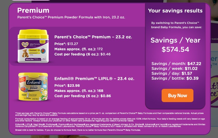 I do believe breastfeeding is best. But I know for some mothers it’s not possible. So knowing that Parent’s Choice™ was almost $600 cheaper a year over Enfamil, I would recommend it to moms that have to bottle feed.
