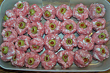 Mix the ground beef, breadcrumbs, ketchup, mustard, egg(s) any seasoning you may like for your “eyeballs”, mix all well, if mixture is too dry add another egg if too soft add more breadcrumbs, form into “eyeballs” and place on a greased baking pan, in the middle of each “eyeball” push an Olive make sure the red filling is on the outside.