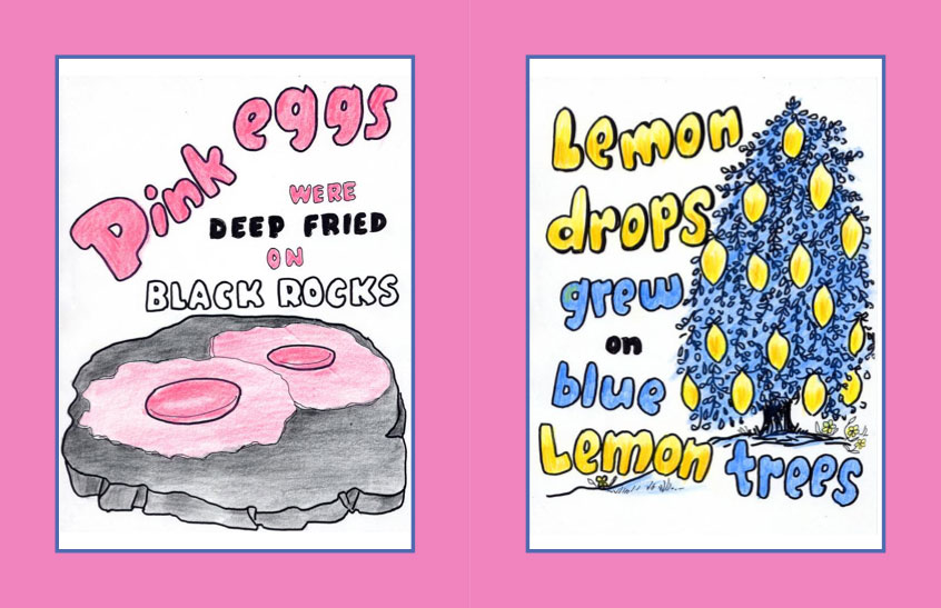 When you look at the book you enter an upside-down world, where kids pants are held up by giant balloons and clouds are stored in boxes. This is a make believe world where icicles only come in 3 flavors and cows give hot chocolate Milk.
