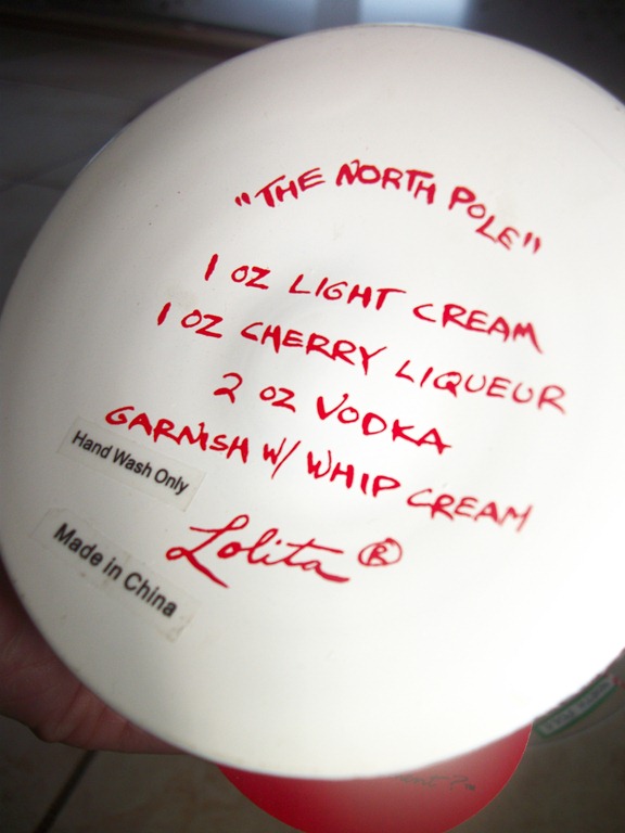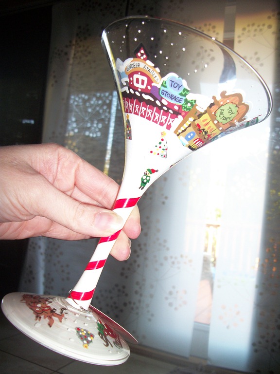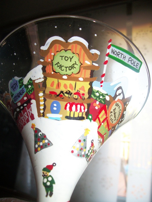 I received one of the Christmas painted Martini Glass and was quit impressed. The painting is beautifully done and on the bottom a martini recipe was printed “The North Pole”. LOVED it!