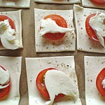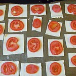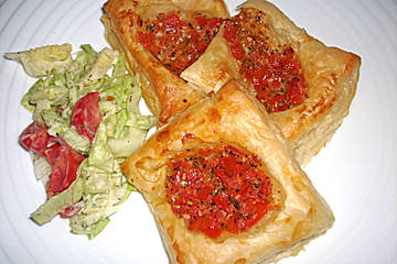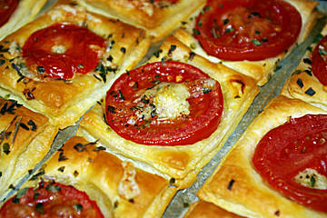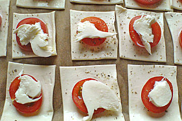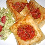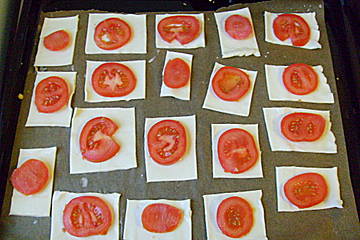 Cut the Puff Pastry in squares, I use a Pizza Cutter makes it perfect… add a Tomato slice to the square and if desired add cheese, I always make one patch with and one without cheese, my kids are somewhat picky, add pepper, salt any other seasoning you may like, Basel and a small drop of olive oil and your squares are ready to go in the oven…