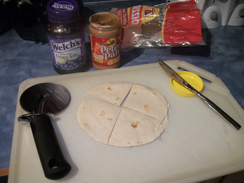 Bread, Peanut Butter and Jelly.. well think outside the Box, you don’t have to use Bread for lunch. How about making a PB&J on Tortillas