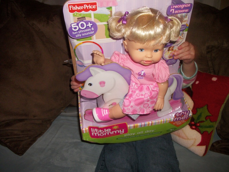 But this Little Mommy Play All Day Baby is a lot different, she is a very cute doll and she can really talk it up! An electronic voice box located in the doll’s back produces over 50 phrases and sounds to keep your child guessing what she’ll say next. You can, like any other doll, turn off the voice-box on the back of the doll, in case she talks too much :-)….
