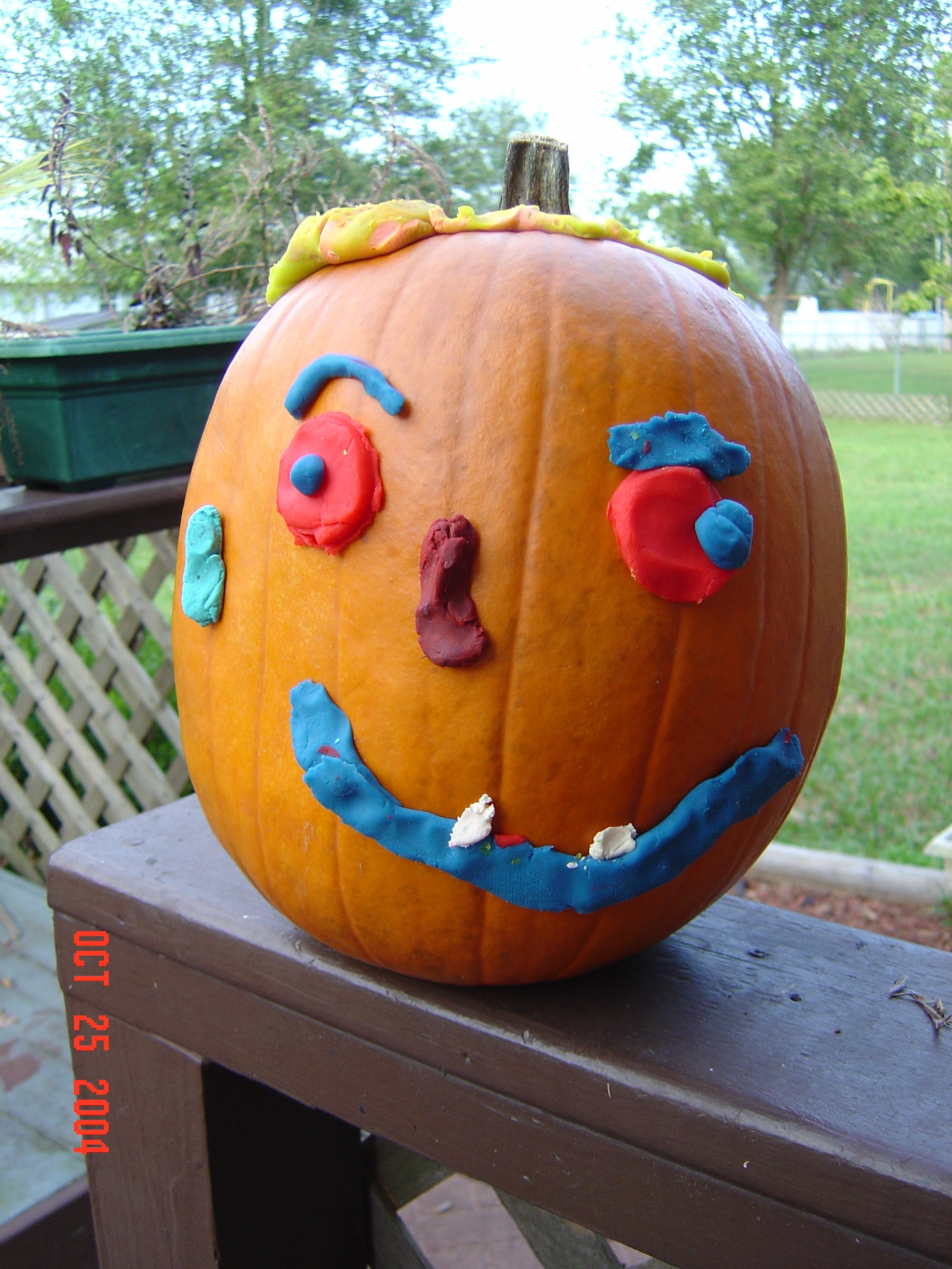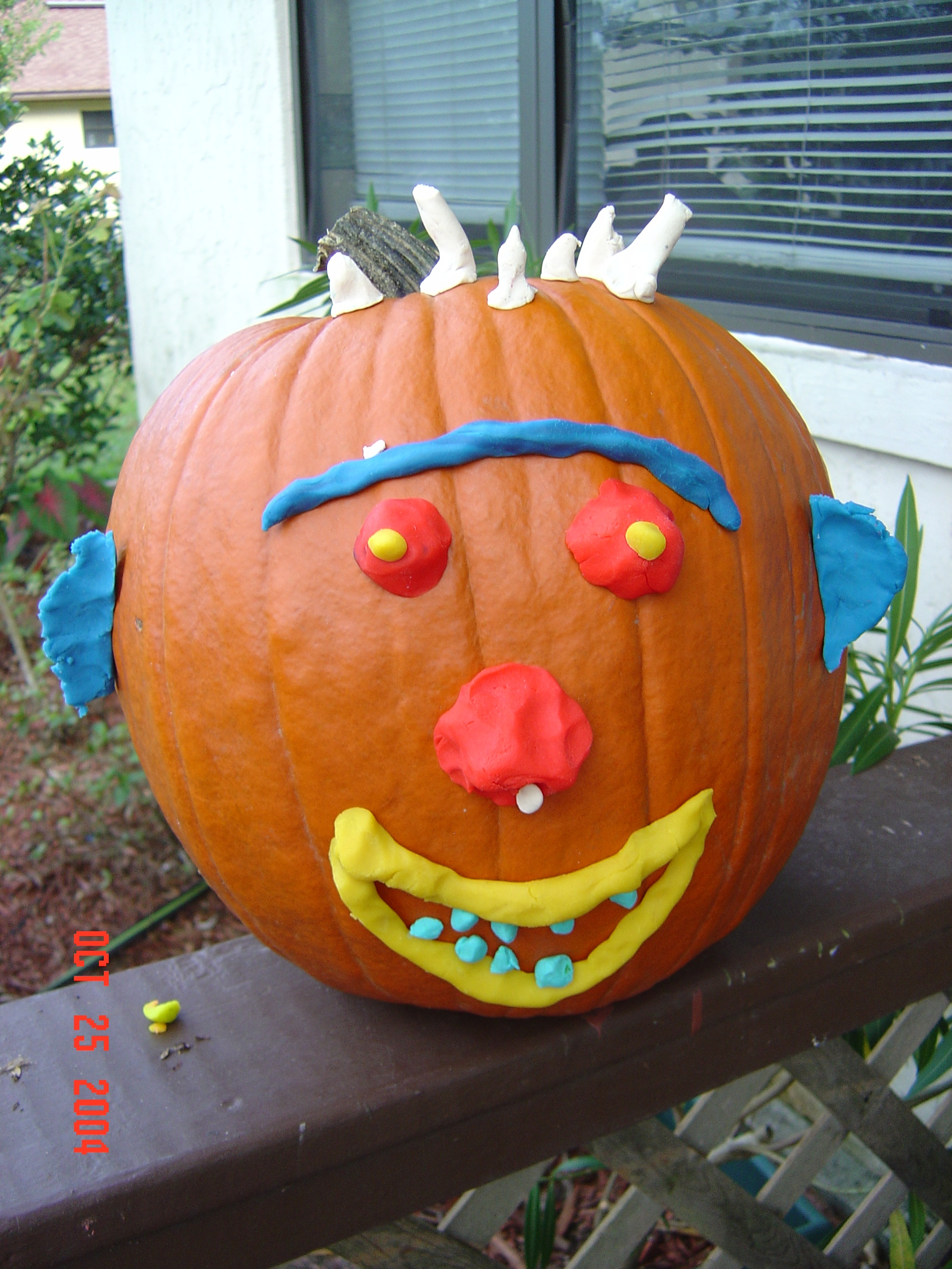 I went thru my Halloween Pictures yesterday and came across this cute craft we did. I for the life of me can not carve a pumpkin, mus be because growing up in Germany we didn’t have Halloween and Pumpkins like that.. so I come up with different ideas each year to decorate our Pumpkins and make them funny looking or scary .. what ever the kids decide. This particular Pumpkin we used the Model Clay, the ones that air dries ( can not remember the name is from Crayola)… I gave it to the kids and let them have at it…. ( you can also use play doughand they can do it over and over again… I like the Model clay cause it will air dry and stay that way)…. This can be done with little ones as well as older kids any size pumpkin will do… Soo much fun for everyone and a LOT less Mess!!!