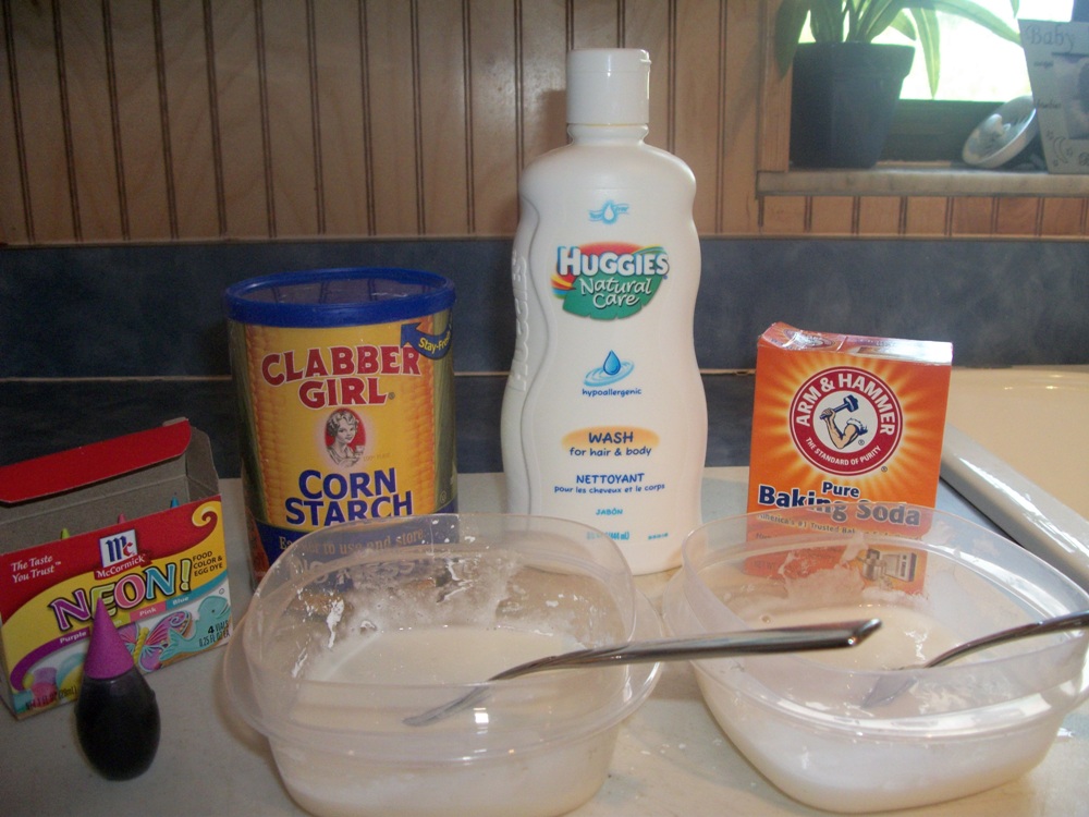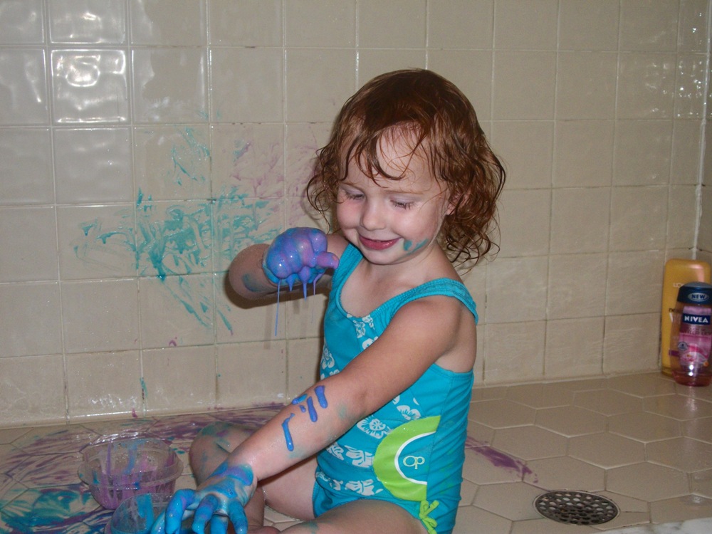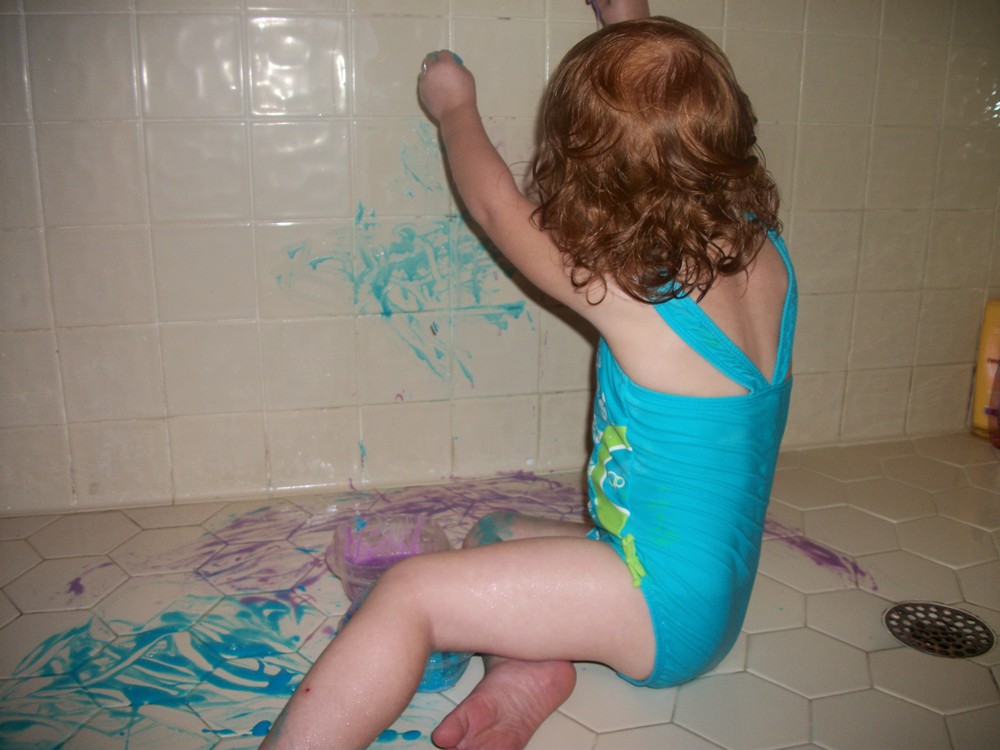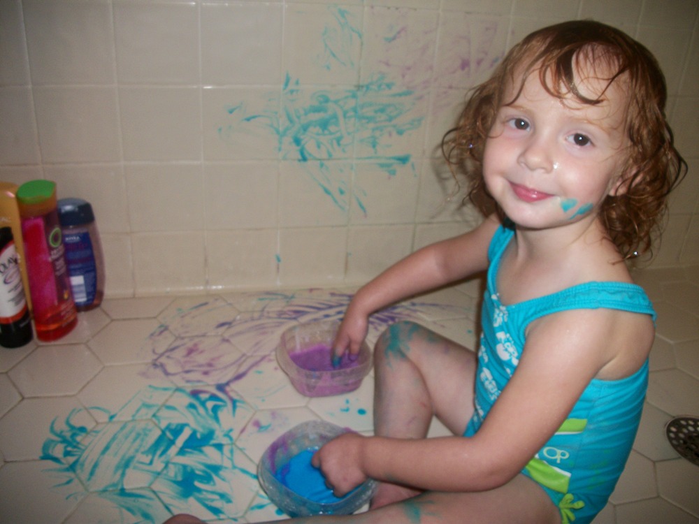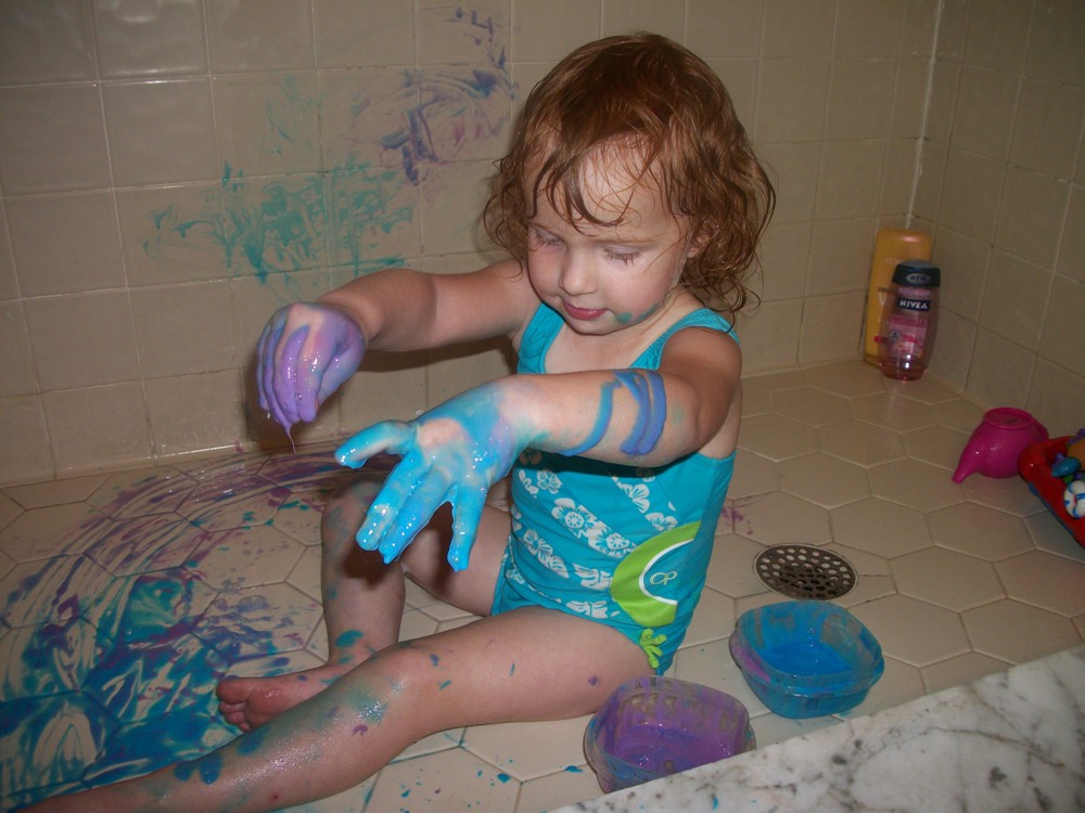 I made two different textures one I used Baby Shampoo and mixed Baking Soda ( had a grainy consistency) and added food coloring and the second one I used baby shampoo and added Cornstarch ( had a smooth Consistency) and foo coloring; mixed it all real well and your Paint is done…… Have fun in the Bath…
