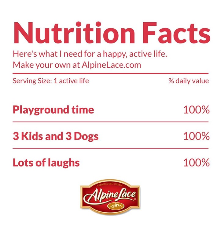 You can share your life ingredients and favorite adventure by creating a Nutrition Label at Alpine Lace.