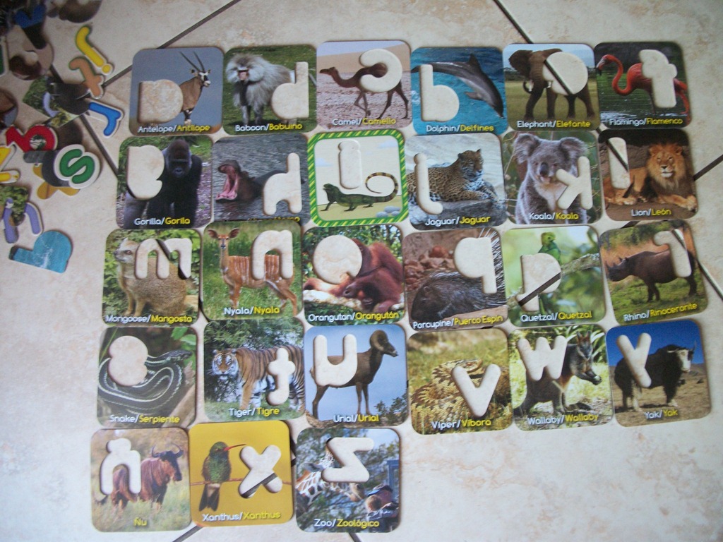We had one more Puzzle to check out and this one is no ordinary Puzzle, it’s different but a lot of fun. The Zafari puzzle was also named as “2011 Puzzle of the year “by Creative Child magazine. The fun part about the Zafari puzzle, you have to match the Alphabet to the animal; the front side has real life pictures of an animal like a Flamingo and the back side has a cartoonish drawing of the animal in fun colors. Your little one will need to match the Alphabet to the right animal. This was a bit hard for my Toddler, but with a little help, she was able to complete, I would definitely say a 4 year old should be fine on his own and a 3 year old will be great with mom or dad’s help. Make this a family time and create a puzzle. So much fun. Talk about the animals and the sounds the animals make to get the conversation started with your little one. This Puzzle also is Bilingual just like the other ones in Spanish and English.