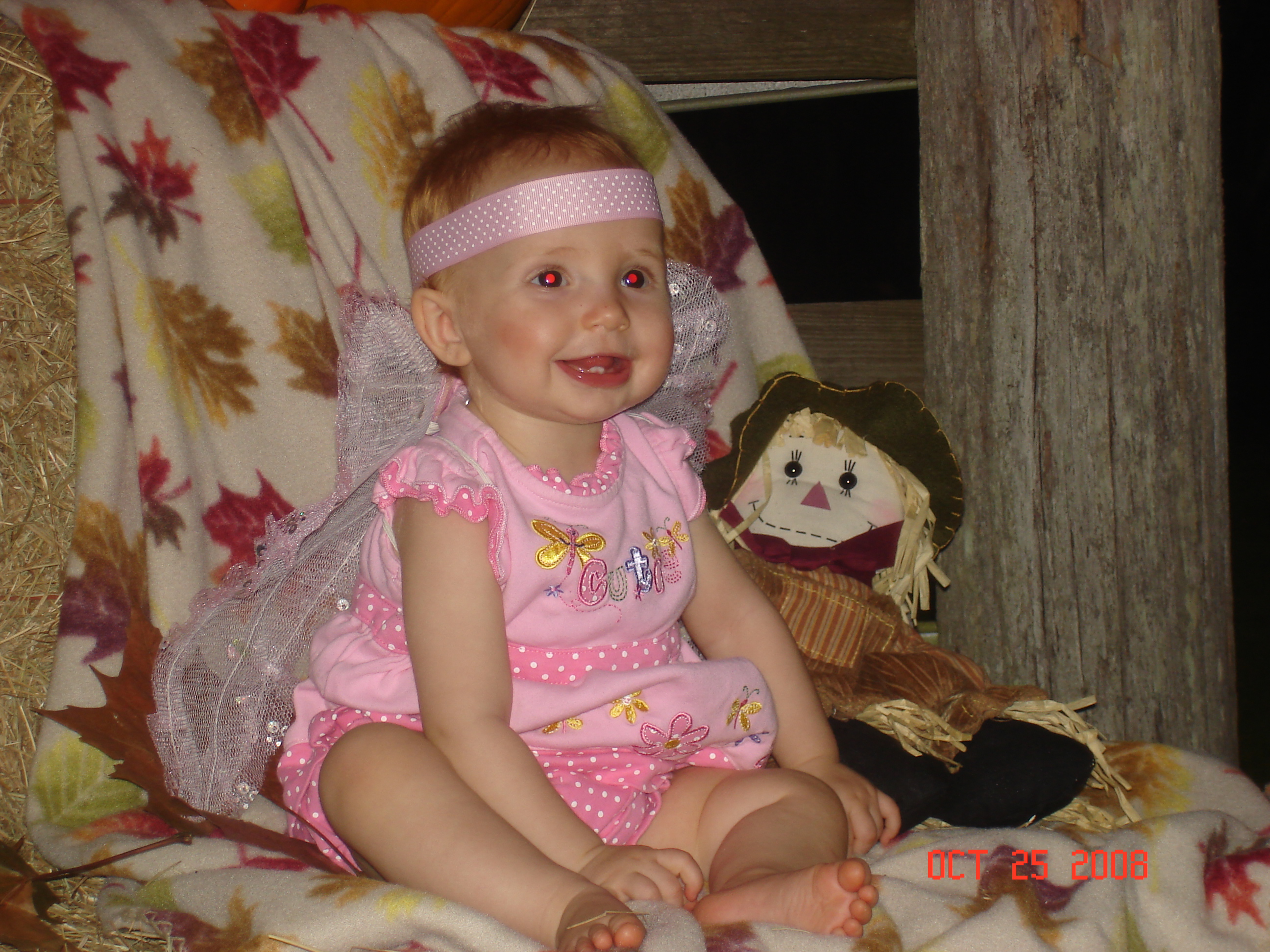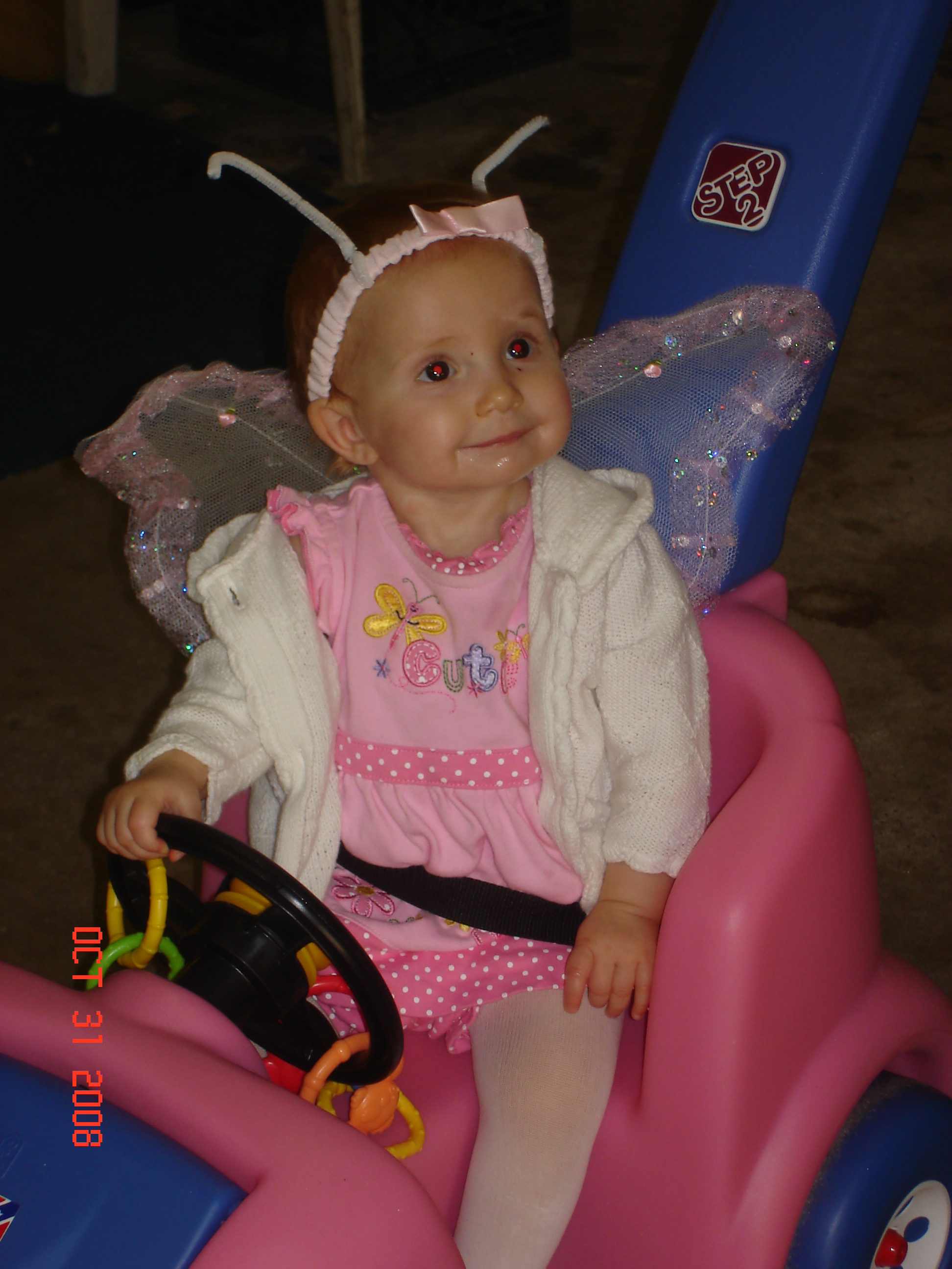 we had the Pink outfit that had butterflies on it already, I attached some cheap dollar store wings and used one of her headbands and attached antlers and put some red cheeks on her and now we have a Butterfly…how simple but yet cute is that….