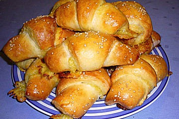- Unroll the crescent rolls and add sliced cheese and ham, roll into crescent rolls