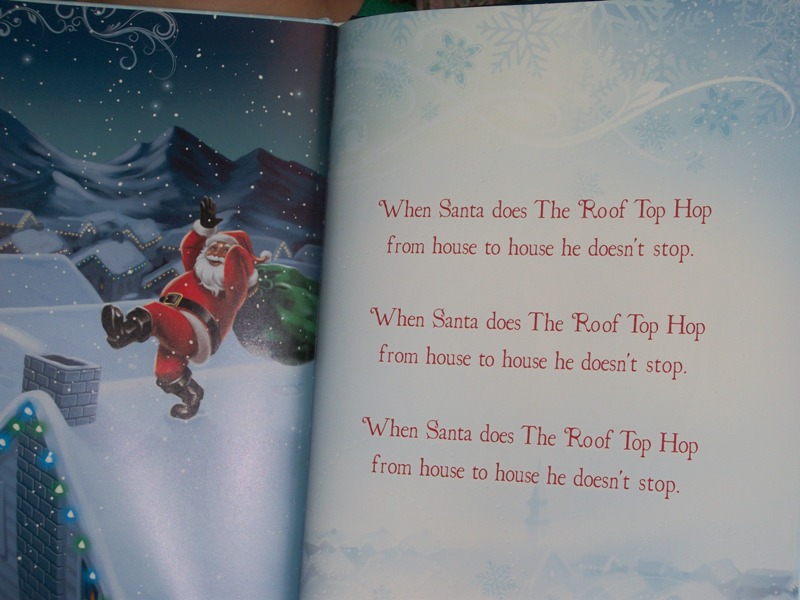 The Pictures in the book are beautiful; I love how Santa looks and the fun part is the DVD has the entire book on the DVD as well so you can pop the DVD in the DVD Player and put the book on the “big” screen and you can read aloud. That what we did and my toddler loved it. She has been asking can I hear it again, please … and now she is trying to learn the The Roof Top Hop .