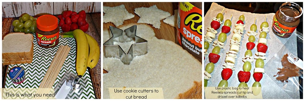Spread just a little bit of the Reese’s spreads on the sandwich bread, a little will go a long way. Once you have your Kabobs assembled take a plastic baggie, add a spoonful of Reese’s spreads and place in the microwave for about 20-30 seconds (do not seal the bag), once the Reese’s spreads is warm and melted take out of the microwave and seal bag, cut the bottom tip off and start drizzling the hot Reese’s spreads across your Fruit & Sandwich Kabobs and enjoy! It’s that simple!