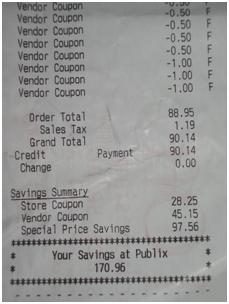 after coupons my total was $90.14 ( includes $ 1.19 Tax) and the savings on the bottom was $ 170.96 !!!! This is almost $300 worth of Groceries for under $100.00, now you tell me these items aren’t in your house???